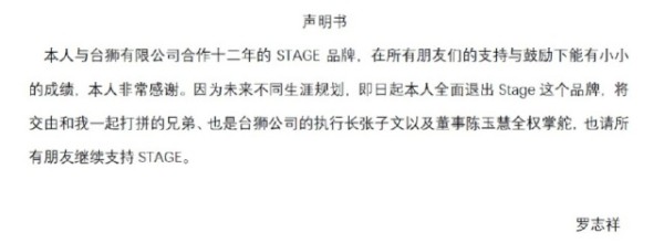 而罗志祥工作室的回应则是,因合作理念与未来的规划不同,才有意退出,并将潮牌STAGE交由曾经打拼的兄弟张子文以及董事陈玉惠全权掌舵。