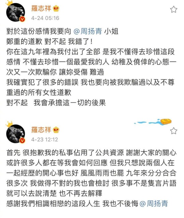 随后,罗志祥发表道歉微博,并未对周扬青指出的“另一部手机撩妹”、“跟多个女生不正当男女关系”、“多人运动”等行为作出否认,并且在昨天凌晨5点再次道歉。