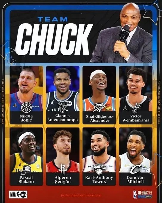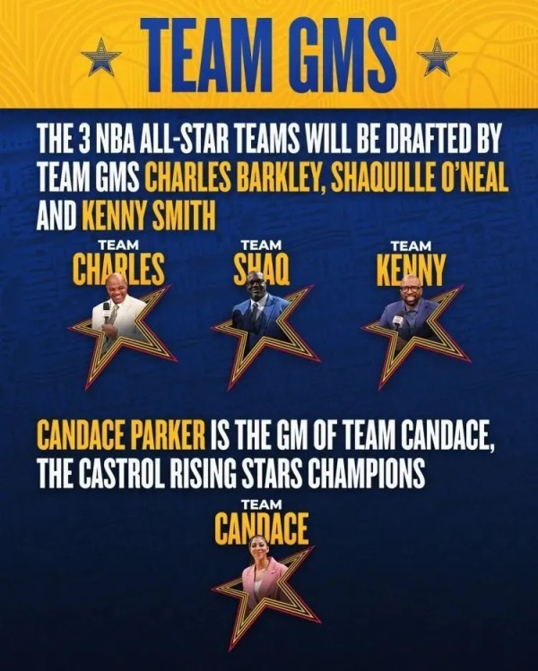 ⭐每支全明星球队将有八名球员,并以TNT NBA分析师的名字命名,24名NBA全明星球员将被平均分成三支球队,名单由TNT解说员和球队荣誉经理查尔斯-巴克利、沙奎尔-奥尼尔和肯尼-史密斯选出。