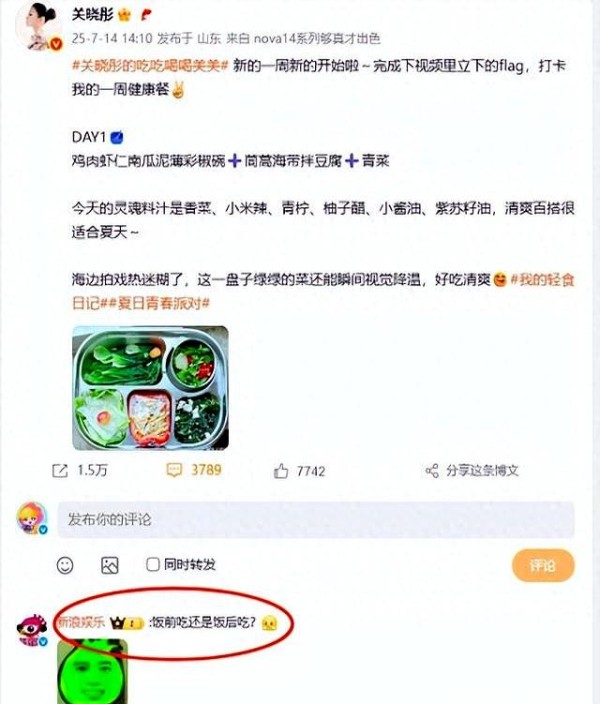 有人调侃,“这量塞我的牙缝都不够!”还有人忍不住问她,“关晓彤你不怕晕菜么?”更有意思的是,新浪娱乐也下场,评论了一句“饭前还是饭后?”——别说,直接把气氛点着了。