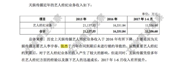 细心的读者会发现,天娱传媒在艺人经纪业务上2016年收入是下降的,根据数据,其2016年经纪业务收入1.63亿元,相比于2015年的2.11亿元下降超过20%,然后2017年收入又迅速反弹回来。
