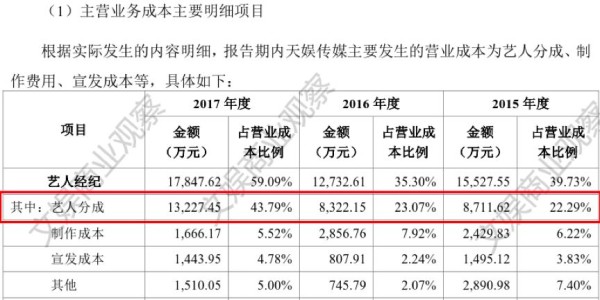 在天娱传媒2017年营业成本的构成中,艺人经纪成本是1.87亿元,但是给到艺人的分成高达1.32亿元,占到艺人经纪成本的近75%,这本身已经说明了一切。