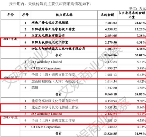 至于张杰,天娱传媒2015年向北京杰奏梦弓长文化传播工作室采购3831.32万元的费用,而这个工作室也是张杰100%控股的,因此可以推测出张杰2015年的经纪分成为3831.32万元。
