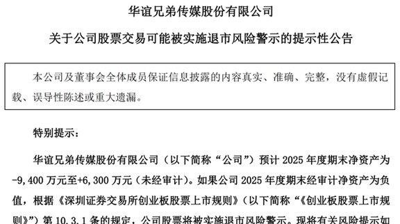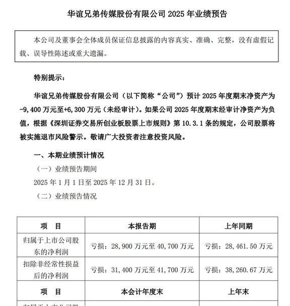 亏损之外,更紧张的是净资产数据,公告里披露,按初步测算,2025年期末净资产在-9400万元到+6300万元之间,这个区间说明公司正好卡在正负之间,一旦年报审计结果落在负值,根据创业板上市规则,股票就要被实施退市风险警示,这对曾经的头部影视公司来说,是一个非常难堪的局面。