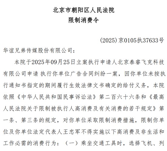近日,华谊兄弟传媒股份有限公司(300027.SZ)及其法定代表人王忠军新增一则限制消费令。该限消令由北京市朝阳区人民法院发布,申请人为北京泰睿飞克科技有限公司,申请缘由为广告合同纠纷。案件流程信息显示,此前,该公司已被执行1140万余元。