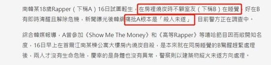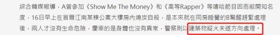 据悉,此次意图自杀的韩星曾在说唱比赛系列中出演的十几岁的少年。警方在接到报案后,立即前往了现场,在听过双方的自述后便让各自回家等待,目前警方正在以“建筑物纵火未遂”的名义进一步详细调查中,决定是否立案处理。