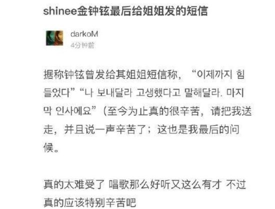 在金钟铉最后发给姐姐的短信中,他表示自己一路走来真的很辛苦,他希望爱他的家人可以把他送走,这就是她最后的问候。因为长期心理问题,金钟铉最终还是选择了用这种方式来跟世界告别。