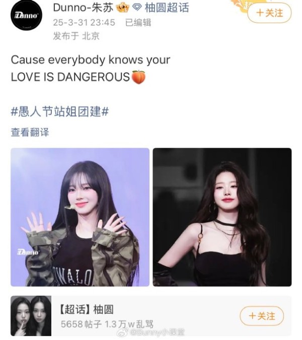 朱苏CP站姐"唯爱战地玫瑰"在2026年愚人节站姐团建活动中发布虞书欣与赵露思内容,引发"鱼香肉丝"CP热议,延续其横跨韩娱与内娱的运营传统。