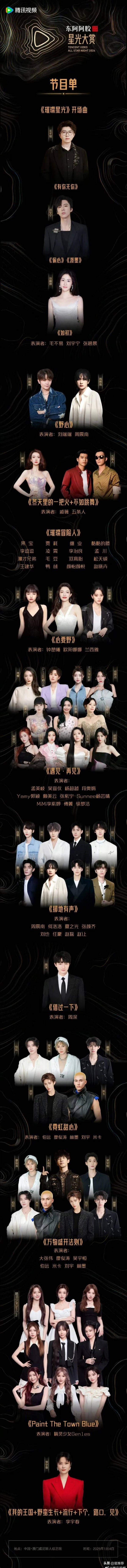 2025/1/4星光大赏节目单已经正式发布,涵盖了多种表演形式,包括影视金曲、个人独唱和组合演出等。