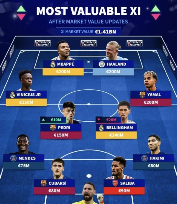 最值得关注的是中场位置三人的身价变化。佩德里、贝林厄姆、维尼修斯组成的价值链条,几乎就是各自球队攻势足球的晴雨表。