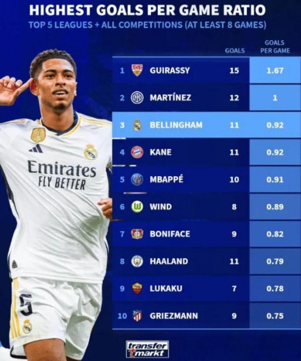 反观贝林厄姆,德转的口径并不是“踢得差”,而是“地位下降”。他的影响力确实没维持住赛季初的高峰期。从欧冠数据他7场比赛交出2球1助,传球成功率超过91%,基础输出依然稳健,但他从中前场核心到前插终结点的多重角色,在皇马当前体系中出现了淡化。他不再以一己之力决定比赛走势,这才是下调的核心原因。