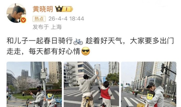 2026年4月4日,清明假期的上海街头,春风和煦。 48岁的黄晓明在社交平台晒出一组照片,他骑着一辆普通的黄色共享单车,身旁是9岁的儿子小海绵,骑着黑色儿童自行车。 父子俩穿着同款浅灰色卫衣,在林荫道上并肩骑行,在斑马线前击掌合影,画面温馨自然。 配文很简单:“和儿子一起春日骑行,趁着好天气,大家要多出门走走,每天都有好心情。 ”