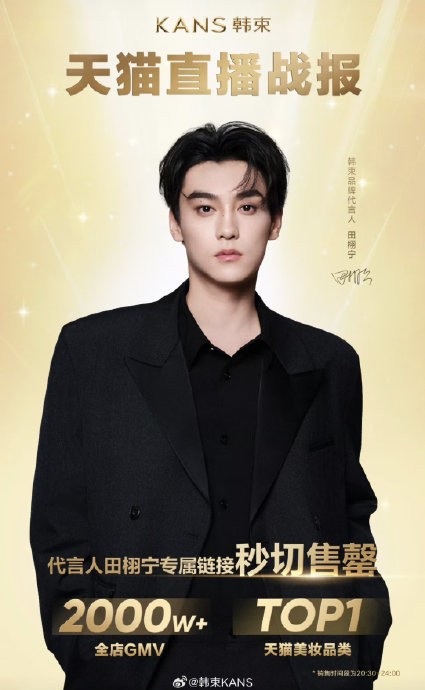 韩束合作:首场直播1小时销售额达2500万,官宣当日品牌总销售额突破6000万;第二场直播3.5小时销售额再破2000万,专属链接商品1分钟内售罄。合作期间总销售额突破1.05亿,登顶天猫美妆品类TOP1。