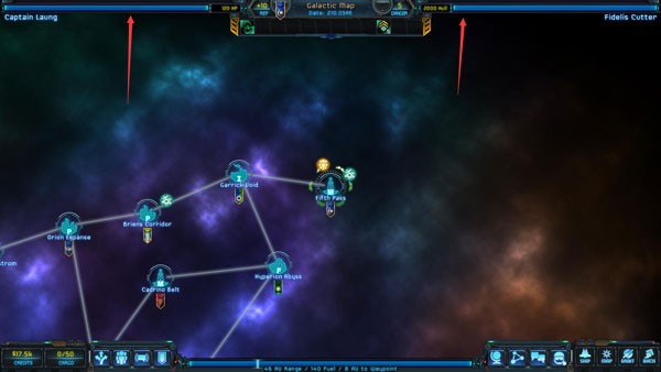 左上和右上的两条蓝条分别代表船长的血量和飞船的血量(以HP和Hull值表示),往中间靠拢可以看到当前星系的所属派系和该派系对玩家的好感度(鼠标移近可以看到玩家在该派系担任的角色等级,包括军事((影响派系船只面对玩家的飞船的应对))、贸易((影响玩家在该派系的买卖许可和货物数量))、法令等级((影响玩家通过合约联系人获得的任务))