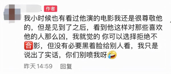在评论区中,爆料者还表示,如果不喜欢跟粉丝合照,他可以拒绝,但是现场摆出不配合的表情,就是让人难以接受。
