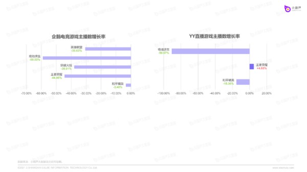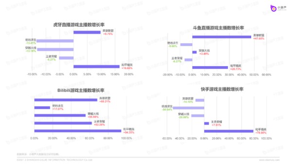 与「全员增长」的B站恰恰相反,在五款热游上,企鹅电竞的游戏主播们都有着不同程度的流失,而流失率最少的《和平精英》主播,在其余各平台正在如火如荼的成长着;《英雄联盟》主播依然是香饽饽般的存在,在头部直播平台中保持着数量可观的增长;《王者荣耀》主播在B站、快手和YY直播都有增长,而在斗鱼、虎牙平台稍有流失;《穿越火线》主播只在斗鱼和B站上有所增长,在虎牙和快手上呈负增长。
