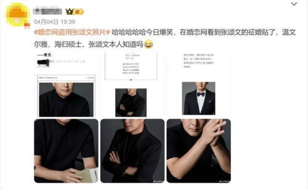 征婚贴资料显示,他是做金融投资的一名海归硕士,性格温文尔雅。推文中描述了现居上海的男士“青芜”的家庭背景、学业、事业等个人情况,意在为其寻找婚恋对象,但使用的照片几乎全是张颂文公开曝光过的照片,只不过截去了半张脸