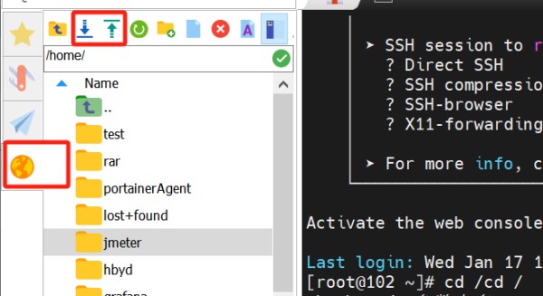 也可以通过mobaxterm左侧的导航窗口,选择橙色地球仪形状的SSH browser,然后点击上方的按钮进行上传或者选中文件进行下载,如右图。