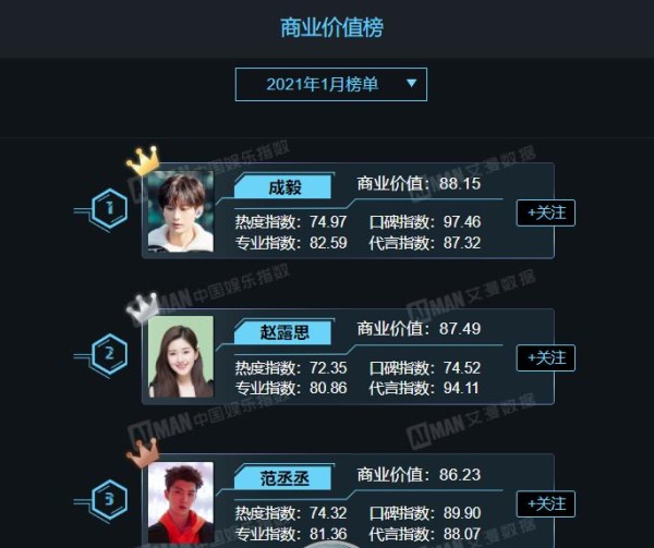 2021年1月份的明星商业价值榜出炉,在潜力明星榜单上,成毅、赵露思和范丞丞分列前三位。