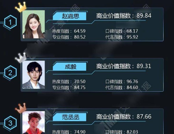 毕竟如今娱乐圈中的竞争压力而言也是很大的,若是在娱乐圈中的作品不够频繁,是很容易会被其他新晋艺人刷下去了。首先我们先来看看在5月份的潜力明星商业价值榜中的前三名,排在第一位的是赵露思、第二名的是成毅,而第三名则是范丞丞了。