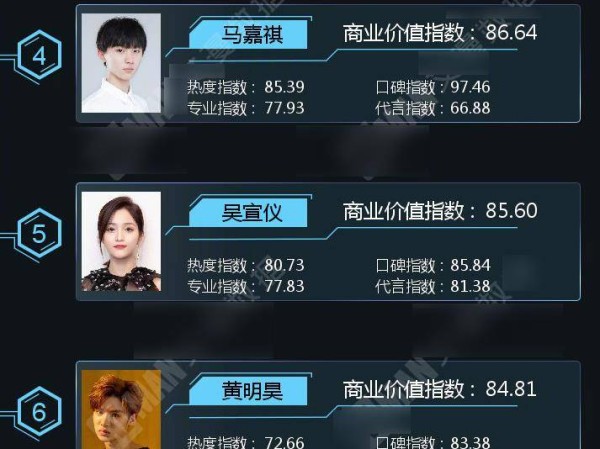 看完在潜力明星商业价值榜中的前三名,下面让我们来看看后面的艺人排名吧,首先排在第四名的是马嘉祺、排在第五名的是吴宣仪,而排在第六名就是黄明昊了。