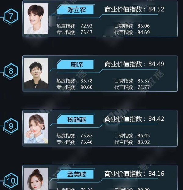 最后在潜力明星商业价值榜中,陈立农排在第七名,周深排在第八名,杨超越排在第九名,而最后一名就是孟美岐了。