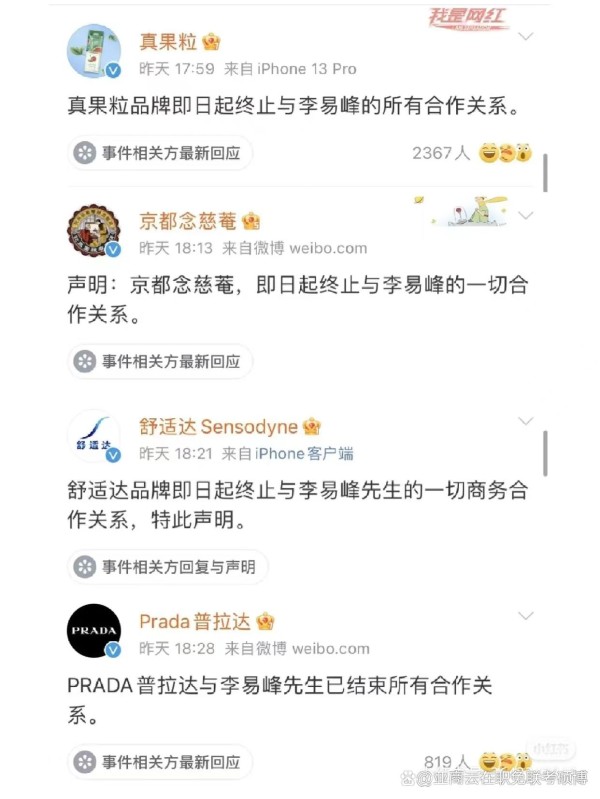 据不完全统计,此事件后李易峰所代言的普拉达、高尔夫、六福珠宝、蒙牛真果粒、京都念慈庵、沛纳海、人头马等13个品牌均终止了与其的合作。