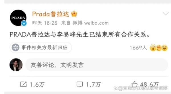 因此,因为带货的原因,因为分散风险的三代言策略,因为快速的解约反应,普拉达的公关处理可圈可点。