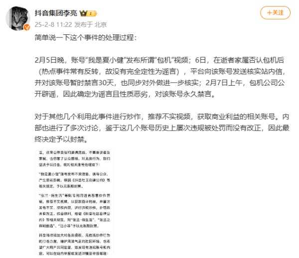 2月5日晚,账号“我是夏小健”发布所谓“包机”视频;6日,在逝者家属否认包机后(热点事件常有反转,故没有完全定性为谣言),平台向该账号发送核实站内信,并对该账号暂时禁言30天,也同步对外做进一步核实;2月7日上午,包机公司公开辟谣,因此确定为谣言且性质恶劣,对该账号永久禁言。