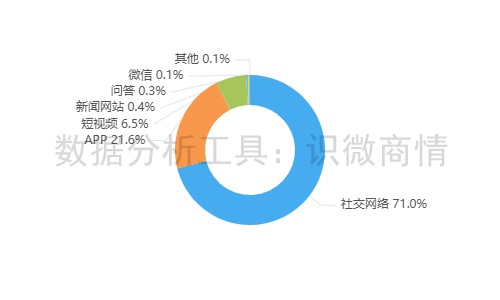 该时段内,有关“张兰汪小菲短视频账号被封”的舆情主要集中在社交网络平台,相关舆情量约占总量的71%,其次为新闻APP(约占21.6%),短视频(约占6.5%)。