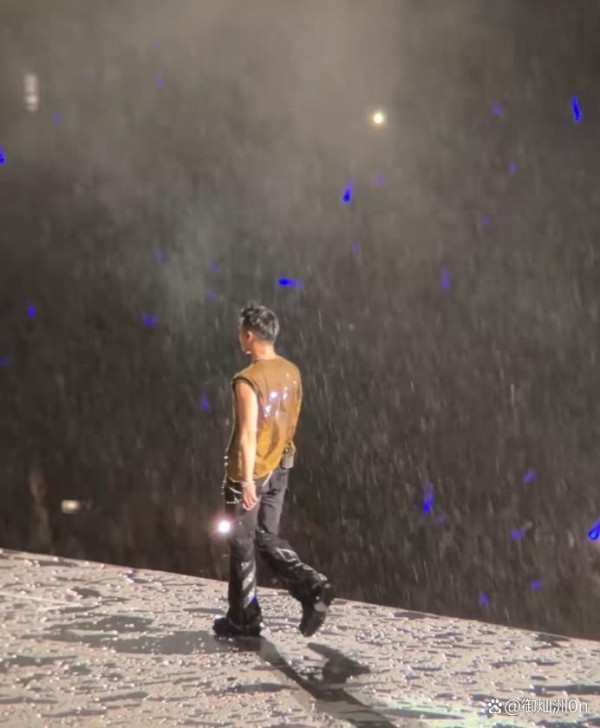 在广州大学城体育中心,台风带来的暴雨像从天上直接倒下来一样。 晚上八点,舞台上的积水已经能淹没脚踝,灯光在雨幕中变得模糊不清。 谢霆锋站在舞台中央,白衬衫早就湿透紧贴在身上,雨水顺着头发成串往下滴。 他握着麦克风的手很稳,唱到《因为爱所以爱》副歌部分时,突然抬头对着漫天大雨喊了一句:“我叫谢霆锋不是谢停雨! ”台下上万名穿着雨衣的观众瞬间炸了,有人跟着吼,有人抹脸上的雨水,分不清是雨水还是泪水。