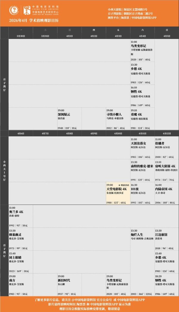 所有场次均可在淘票票、中国电影资料馆APP购票,具体排片见次图,祝大家观影愉快。❤️