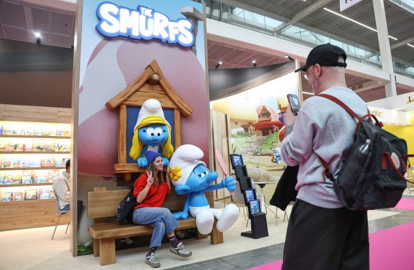 4月13日,在意大利博洛尼亚举行的博洛尼亚国际童书展上,观众与“蓝精灵”卡通形象合影。 新华社记者 王楷焱 摄