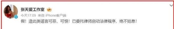 4月21号晚上,张天爱工作室发了声明。就一句话:“假!可恶,可恨!”底下附了律师委托函和法院立案编号。没解释、没喊冤、没拉踩别人,就是把白纸黑字甩出来。这比发一百条“我什么都不知道”有用得多。因为法律文书不会写错字,也不会P图,更不会靠“我觉得像”来定性。